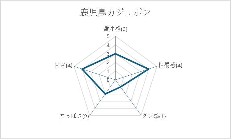 | 原材料名 | 醤油(小麦・大豆を含む)(国内製造)、砂糖、発酵調味料、醸造酢、相橘果汁(レモン、かぼす、タンカン、ゆず、ダイダイ、ゆこう、すだち)、食塩、かつお節エキス/調味料(アミノ酵等) |